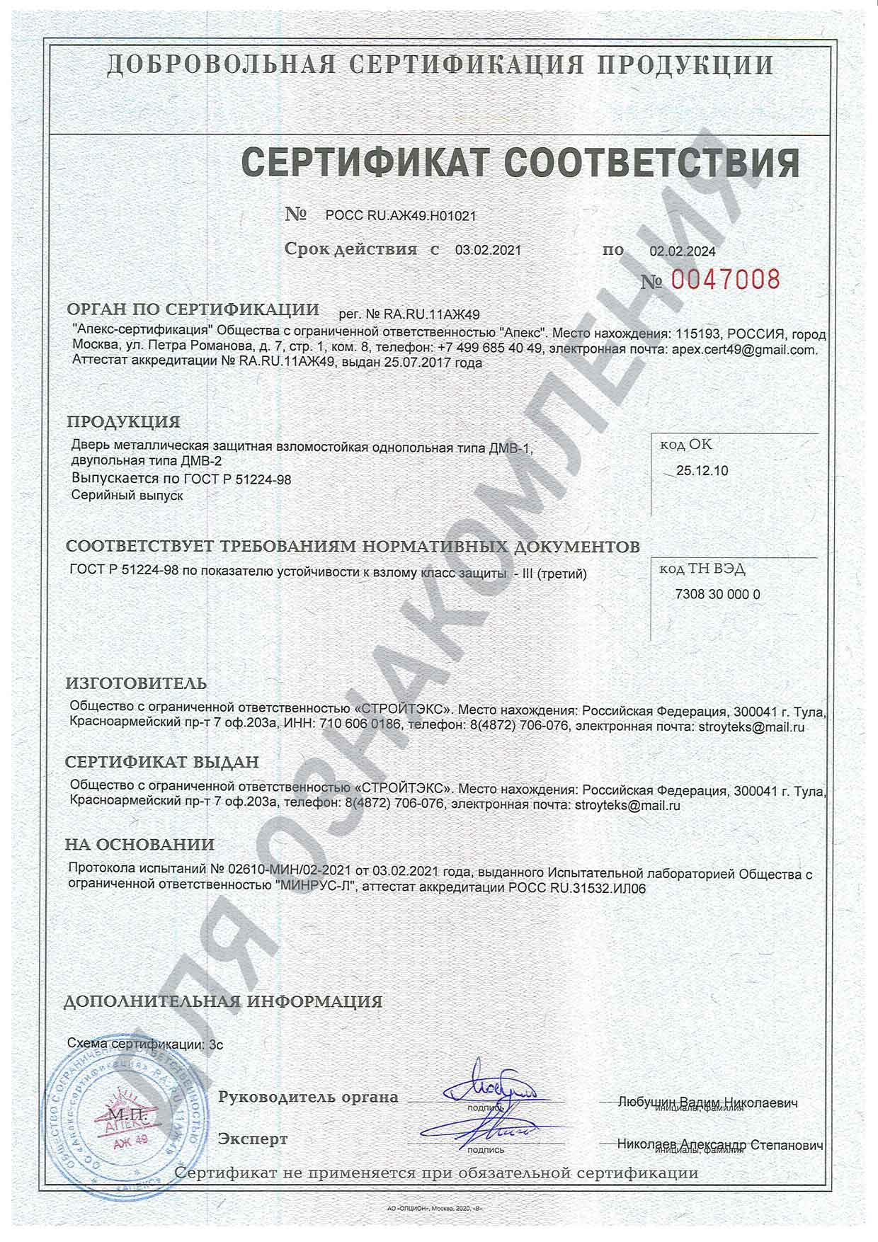 Мы не хотим утомлять вас длинными номерами ГОСТов и законов. Скажем только, что наши двери соответствуют всем требованиям и прошли все необходимые испытания. Посмотрите сертификаты!